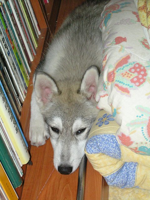 그래서 아직까지도 병원 쌤께서는... 저희 솔이는 얌전하고(병원가면 저희 다리에 지 다리 탁 올려놓고 의자에 길다랗게 앉아서 절대 안움직입니다... 여시같은 것) 똑똑하고(밖에 나가서 사람 많을 때 훈련시키면... 말 잘듣습니다. 집에선 무시하면서... 나쁜 놈) 쥔만 아는 그런 아주 멋지고 괜찮은 허스키로 알고 계십니다. 이런 녀석이면 10트럭이라도 가져다 줘도 다 기를 수 있다고 언젠가 이야기 하시더군요... 10트럭.... 1마리만 이런녀석 더 기르면 집이 무너질 것 같았는데... 쌤은 모르셨죠. 이 녀석의 실체를...