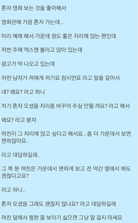 내가 후드눌러쓰고 혼자 보고있는데 나한테도 왠 커플에 남자가 그러더라 그래서 내가 싫어요 작게 말하니까 아좀 바꿔주세요 하고 어깨를 잡데 남자가? 근데 내가 앉은키가 작은데 일어나면 185에 좀 무섭게 생겨썽 후드 저치고 일어나면서 그새끼 콜라 뺏어서 한입 빨고 싫다니까 신발롬아 하니까 뒷걸음치다 주저않고 가더라 ㅋ