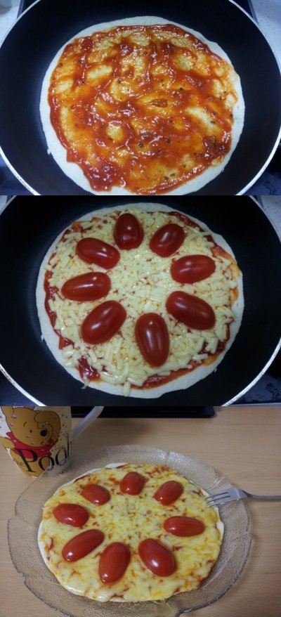 친구들 놀러왔을 때 샀던 또띠아와 피자치즈로 금방 만들어 먹은 피자.