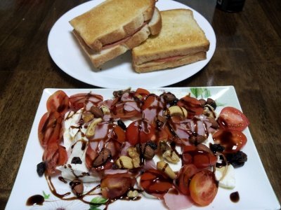 카프레제 샐러드와 햄치즈토스트.