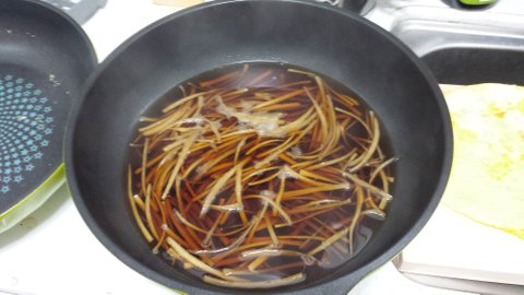 우엉은 공기에 노출되면 색이 변한다고 해서 물에 담가두었어요