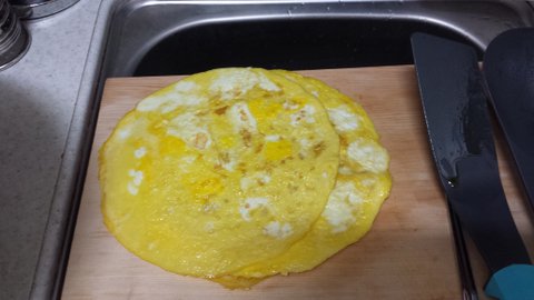 엄마는 직사각형 후라이팬에 계란을 만들어서 썰었던 기억이 있는데 집에 큰 둥근 후라이팬 밖에 없어서 그냥 큰 지단을 만들어서 떡국 고명 썰기를 하기로 했어요
