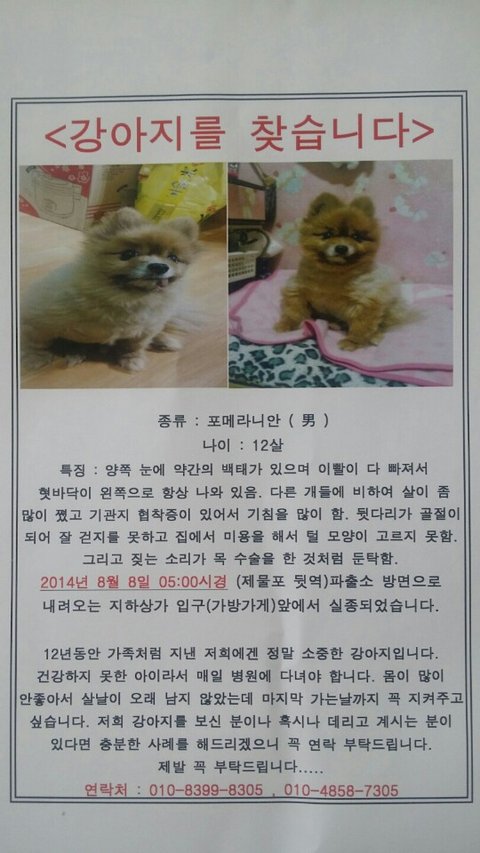 제가 11살부터 23살까지 12년동안 가족같이 붙어있던 강아지입니다. 2014년8월8일 새벽5시경에 인천 제물포역 지하상가 뒷역(파출소)방면에서 가게앞에서 앉아서 자고있던 강아지가 실종되었습니다. 바로 앞가게에 주인이있어 목줄은없었으나 목걸이는있어 누가봐도 키우고있는 강아지로보였습니다. cctv확인결과 어떤남성분이 들고 뒷역방면으로 나간것을 확인하였습니다. 악의로 가져가신걸수도있고 불쌍해서 들고가신걸수도 있겠지만 건강하지못한 아이라서 더 걱정되고 살날이얼마남지않은 아이인데 정말 마지막까지 지켜주고싶습니다. 혹시라도 목격하신분이나 데리고있는분이 계시다면 충분한사례를 할테니
