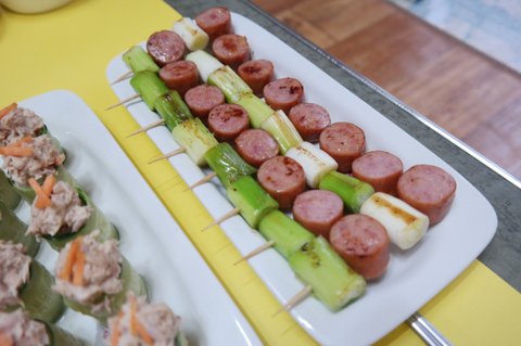 요건 소시지, 대파를 번갈아 꽂아 구우면 간단하게 완성.