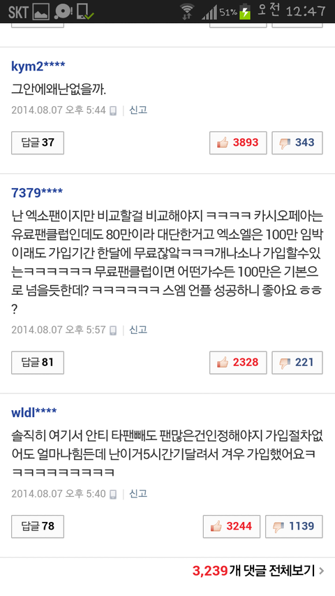 댓글잘봤는데요, 다음카페에 엑소엘공카가 있다는 소리는 또 머죠? 공카없습니다 다음대신 공홈이 있는거고요, 다시말하지만 다음카페 가입하는것도 무료입니다. 도대체 뭐가 불만인거죠?