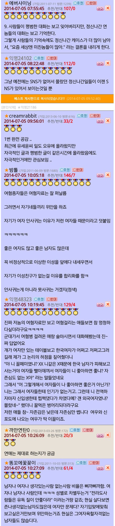 저깃는 댓글하나하나가 주옥같노.. 격한공감 여혐종자들보면 나까지 남혐걸릴것같다 넷상에서 겪어본바론 여혐종자들중엔 그냥 상식이안통하고 말같지도않은 개논리 들이대는 놈들이 태반 상대하기도싫어질뿐 지치고 질림 한마디로 극혐