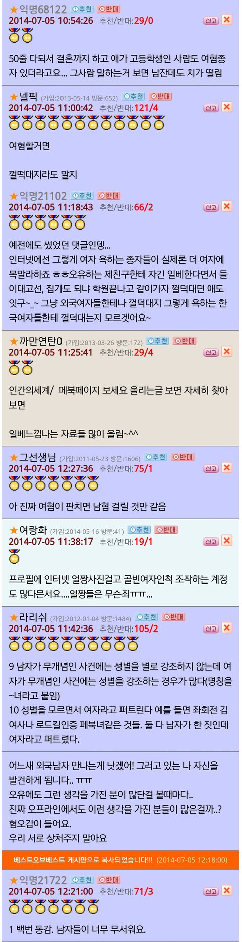강호순,조두순,유영철 엽기적인 이사건들에 대해 여자들이나 남자들이나 딱 그사람만 깜. 근데 여자가 저런일로 나오면? 명불허전 한국녀 ,삼일한 안해서 그래 이런댓글들 많더라.