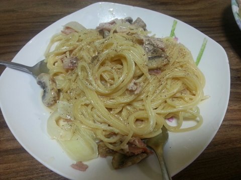 까르보나라는 만들기 참 쉬운거같아요 ㅎ 마늘로 향내고 버섯 양파 베이컨 들들볶다가 우유 넣고 생크림넣고 슬라이스 치즈넣어서 졸이몬 완성~ 간은 소금후추로 ㅋ 꾸덕꾸덕 크림이 일품!!