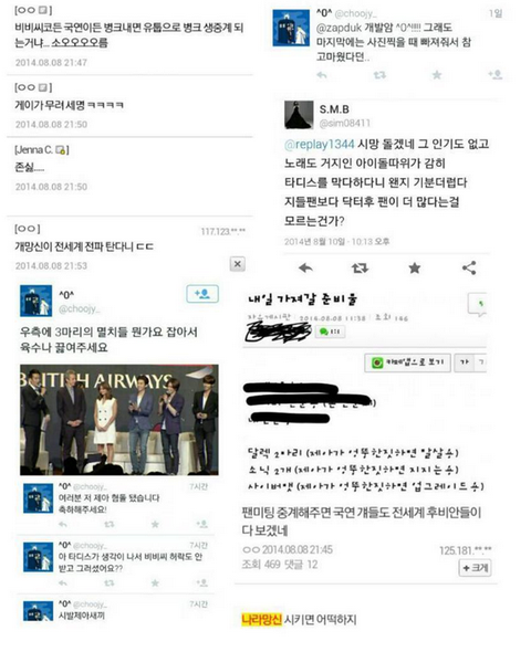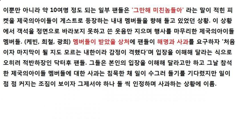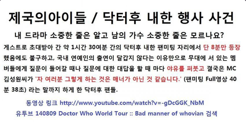 2일 전, 제국의아이들 멤버 황광희, 케빈, 정희철은 닥터후 팬이벤트에 팬으로 초대를 받아서 갔습니다.제국의아이들이 무대에 서는 순간, 갑자기 반응이 싸늘해지더니 멤버들이 말하기 시작하자 갑자기 야유가 곳곳에서 터져 나왔습니다.분위기가 조금 가라앉을 때, MC는 이번에 나온 신곡 '숨소리' 뮤비에 타디스와 비슷한 전화박스가 나왔다며 그 부분을 보자고 했습니다.그 때 후비안(닥터후 팬)들은 정말 듣기 싫다는 맕투로 야유를 했습니다.그러고 나서 정희철 군이 소개를 할 때, 사람들은 중간에 욕을 했습니다.더는 안되겠다 싶은 MC가 오죽했으면 이러는 건 매너가 아니라고까지 했을까요.