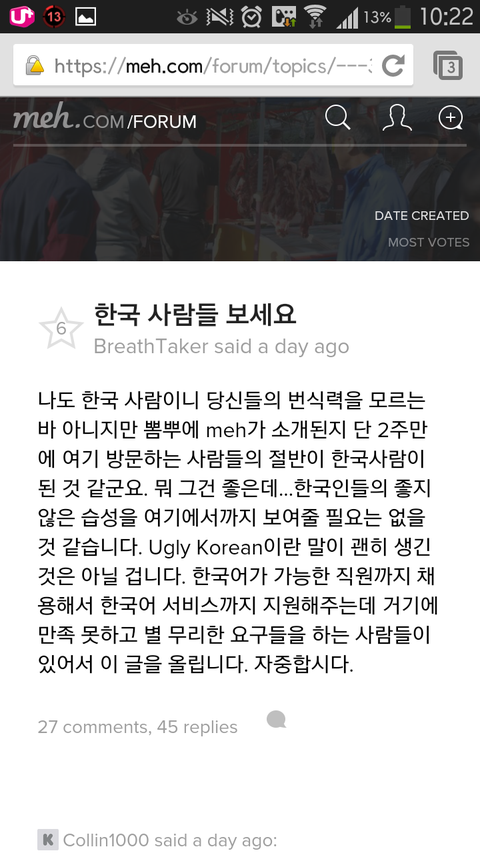 메이 입에 수건 쳐 물었냐? 아님 너도 뿜거지중 한명이냐? 이거 정확하게 사건 말하자면 meh에 우리나라 성격으로 하면 자유게시판 정도가 있음 한국인 운영자가 생기기전엔 그나라 사람들이 영어로 서로 제품에 대한 궁금증을 풀어주고 운영자에게 건의하는 용도로 사용되었음 근데 한국인 운영자가 생겼다는 공고가 뜬후 뿜거지들이 창궐 돼지코 공장도매가격으로 100원도 안하는데 서비스로 챙겨주면 안되냐 네덜란드 어떤사이트는 무료배송해준다는데 해줘라 등등 말같지도 않은 소리를 함 그걸본 다른 한국인들이 나라망신좀 그만시켜라 미국은 원래 100V가 정상이며 돼지코도 우리나라보다 비싸다 등 반격을함 그러자 뽐거지들은 소비자의 권리네 아니 우리나라는 220V니깐 돼치코좀 껴주면 안되냐 대신 그나라 사람들한테는 다른 사음 품을 주면 안되냐 라는 개소리 시전 점점 계시판이 한국어로 도배되고 이걸본 미국인들은 한국말이 넘처나는 게시판을 보고 한국을 비하 악순환이 계속됨.... 이것만 알아주길 바람 당신들이 하는 행동이 평소 당신들이 욕하는 어글리코리안의 전형적인 모습이라고