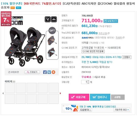 요즘 쌍둥이 유모차에 관심이 있어서 보고 있는데, 오늘 이거 특가대박할인 떴드라구요 ㅋㅋㅋ
