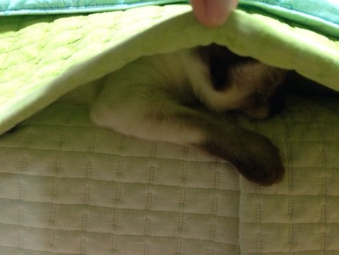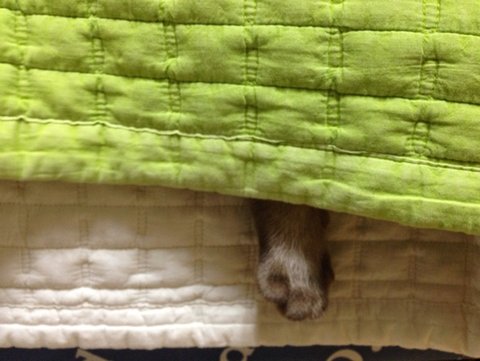 평소와 다른 수상한 침대의 정체를 밝히기 위해 살짝 들춰보아요.