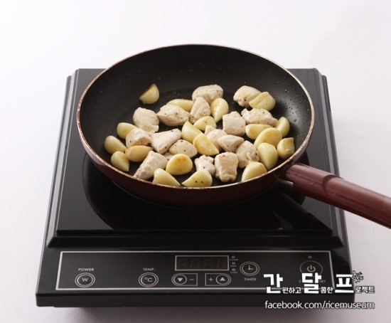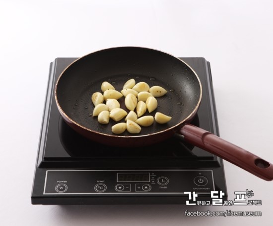 2. 팬을 달궈 포도씨유를 두르고 마늘을 노릇하게 구워주세요.