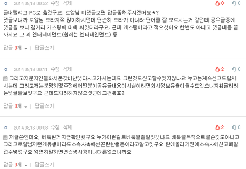 로얄님 지인분들 친분이 잇는 사람 쉴드쳐주고 싶은 마음은 아는데 정도껏하세요 지금 저분 말도안되는게 한두가지가 아닌데 조용히 해결할순 없엇던건가요 지인까지 다 불러내서 댓글단사람들한테 하나하나 시비걸고 참 기가 막히네요 그리고 저는 로얄님의 인맥과 온라인친구들과 편지를 쓰는 여유로움이 부러워서 글을 올리지않앗습니다 망측한 추측 그만하시구요! 진정으로 연예인이란 꿈을 이루고싶다면 신중히 행동하세요 요즘에 연예인들 과거 털리는거 못보셧어요? 카스에 저런 공유글 돌리는것 자체가 진상짓인데 나중에 어떡하실려구요