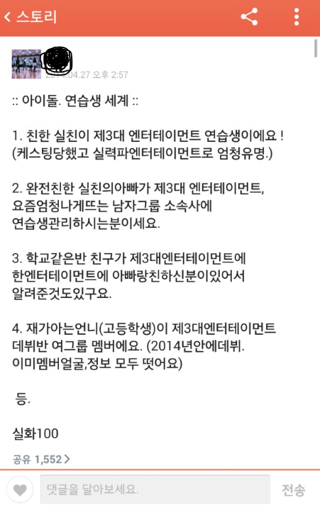 제대로된 정보나마 알려줘야 논란이 안되죠 님이 분명 글내용에 지인이 "올해 데뷔하는 3대기획사 연습생이다" 이렇게 적어놓으셧어요 질문을 할 기회를 준건 님이에요 왜 그거같다가 화를 내시는건지.. 그래서 어떤분이 분명 글내려라 회사의 소중한 정보일수도 잇다라고 하시는거 봣구요 안내리신건 로얄님이에요 이런건 잘못된 온라인 문화로써 판에 올린거구요