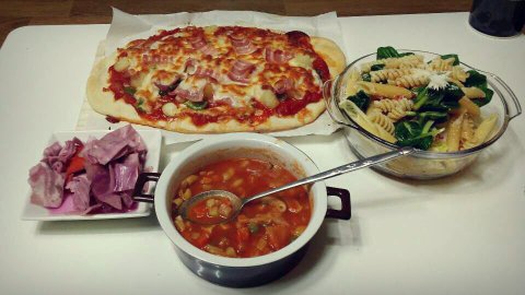 베이컨피자랑 샐러드파스타, 미네스트로네스프 (이름이 뭐이렇게 어려워 걍 토마토스프)