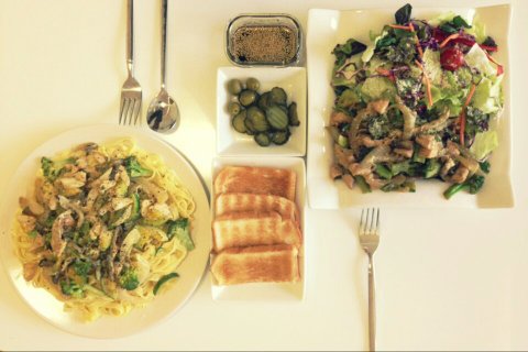 크림카레파스타랑 데리야끼소스 치킨 샐러드