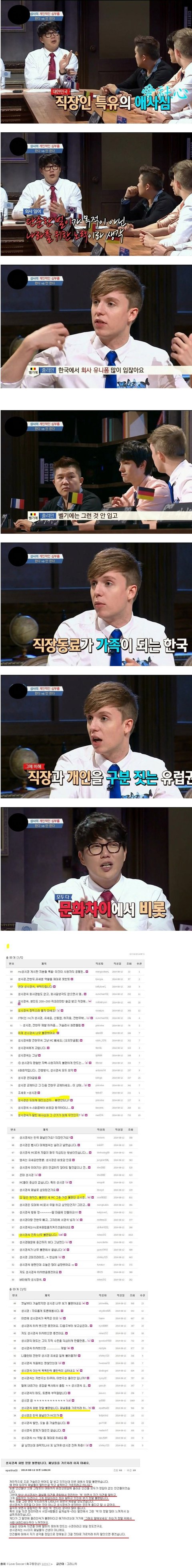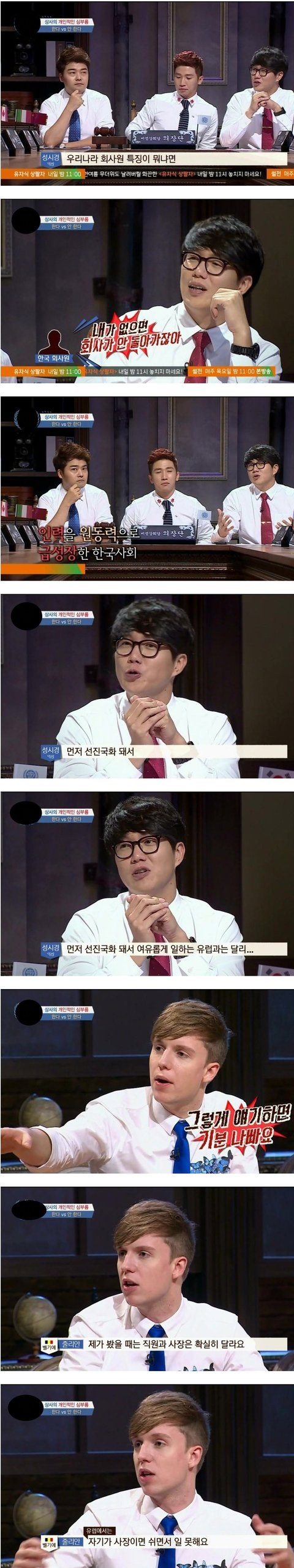 너무 과하게 비난하는 것 같은 느낌은 저뿐인가요. 솔직히 저 방송 처음부터 끝까지 다 보면 아시겠지만 외국인들의 눈에 한국 회사의 문화나 직급에 대한 그런 것들을 썩 좋지 않게 보고 있더군요. 특히 저 벨기에 대표 줄리안은 대화 자체가 공격적입니다. 첫화부터 그랬고 나이 어린 게 말투에서 묻어나요. 줄리안은 자신과 의견이 다르면 절대 포용하려고 하지 않고 '아니 내 말은!'하면서 반박하기 때문에 에네스와도 자주 부딪히고 저번에 이탈리아 대표와도 부딪히고..솔직히 전 성시경이 틀린 말 한 거 아니라고 봅니다. 외국인 동생들이 한국 회사를 이해를 못하니 성시경은 이러이러해서 애사심이 강한것이고 그것이 한국의 문화이다, 라는거죠. 마지막에 말했듯이 문화의 차이예요. 근데 전 오히려 줄리안이 그걸 이해못하고 기분나쁘다고 달려드는게 이해안가네요. 그리고 성시경씨 원래 비호감이었는데 요새 마녀사냥, 비정상회담을 통해 바른 생각을 갖고 있구나 하고 호감을 갖게 됐는데...그리고 회사생활도 안해봤다고 하시는 분들 어리석은 말 좀 하지 마시길. 연예인들이 모두 다 자유롭고 직장인들이 겪는 스트레스를 똑같이 안 받을거란 생각 좀 마세요. 연예인들도 매니저,실장,팀장,사장 등 그들만의 스트레스가 존재한다고 생각해요.