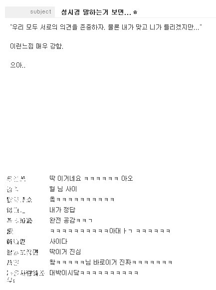 마녀사냥에서 이해심 쩌는척 난 모든걸 포용한다는듯이 앉아있지만 오히려 허지웅보다 남의 의견을 받아드리는면에 있어서 더 막혀있음 허지웅은 비판적이고 이성적인면이 강해서 그렇지 토론의 자세는 좋음 근데 성시경은 남이 말할때 듣긴하겠지만 넌 틀렸어 라고 말하는거 같은 그 특유의 눈빛과 표정 조카 재수없었는데 비정상회담에서도 팔짱 끼고 그 표정으로 앉아있더라