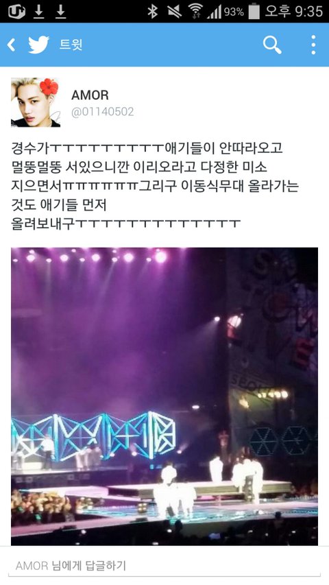 무대 끝나고 사람들이 애기들 깜빡하고 나갔는데 경수가 다정하게 미소지으면서 애기들 데리고 나갔다함ㅜㅜㅜㅜㅜㅜㅜ