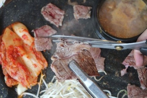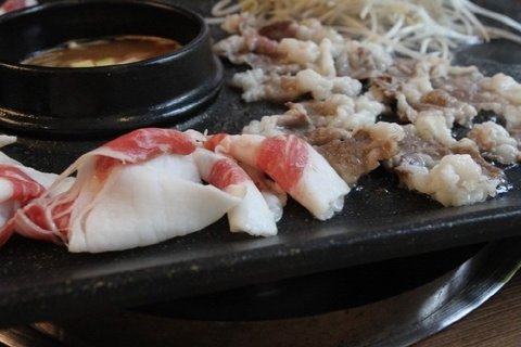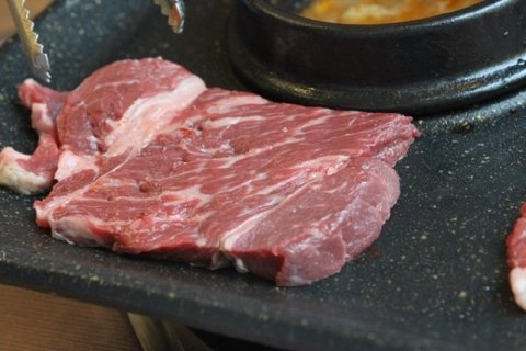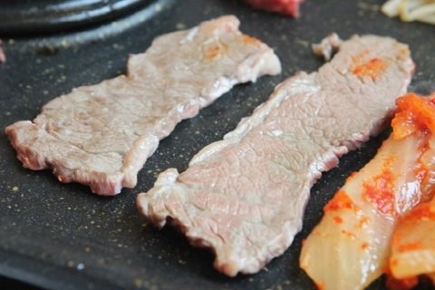 불판에서 금발 차돌박이가 지글지글 구워지니
