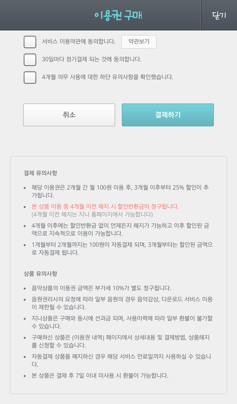이거 월 30곡 다운에 음악감상인데 2달 100원에 이용할 수 잇는 건데 2달만 쓰고 해지하면 반환금 얼마나 나올까? ㅠㅠ