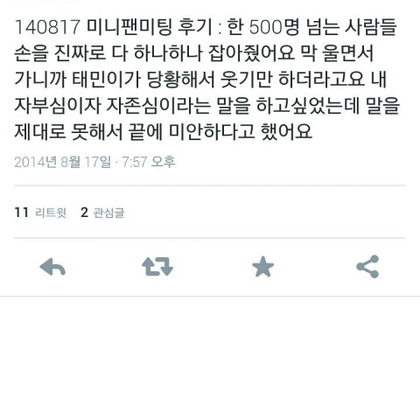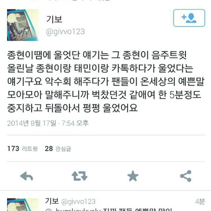 나 솔직히 종현이 트위터보고도 좀 뭉클하긴했지만 그래도 아ㅋㅋㅋ김종현 술취했엌ㅋㅋ이러고 그냥 넘겼는데 태민이가 울줄은 진짜 상상도 못했네요.