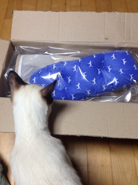 다른 택배 상자에 들어있는 쿠션과 가방이 신기한듯 쿤이가 와서 구경을 해요.