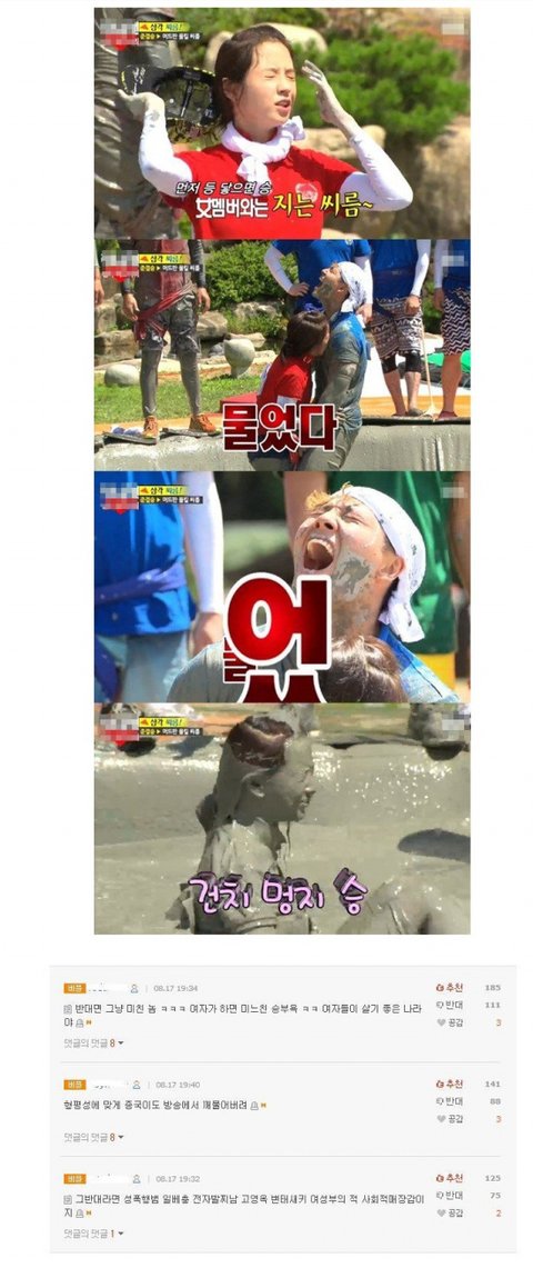 이 장면은 말 그대로 장난식 예능용 그닥 눈쌀 찌푸릴 장면은 없었는데 최근 남여 문제가 하도 심하니 사소한 장면 하나하나 까지 다 까이는듯
