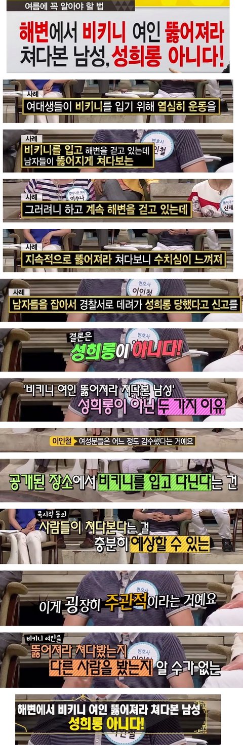 솔직히 비키니는 자기가 운동해서 키웠든 타고났든 자기 몸매 보여주려고 입는거 아닌가요? 남에게 보여주기 싫거나 자기스스로 생각하기에 몸매가 창피한 여자들은 다 가리고 입지 않나요? 아무리 수치감 느끼는 시선을 받았더라도 어느정도 자신에게도 잘못이 있는건데 그거 하나갖고 성희롱이라 신고한다면 그 여자도 남자가 이의를 제기 한다면 성희롱유발죄(실제있음)로 처벌 받아야될겁니다.