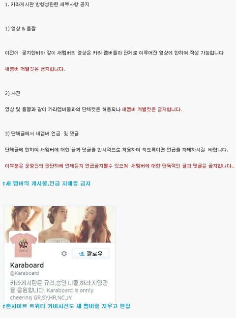 저도 영지로 입덕한 카라팬중에 하나인데요. 저 사이트에서 4인카라를 지지하는 팬사이트가 또 분리되어 나왔습니다. 말하자면 5인카라의 추억을 남기기 위한 팬사이트이며 5인카라 때의 팬분이 남는 곳입니다. 영지를 배척한다거나 그런 곳이 아니라 말그대로 5인카라가 좋아서 남는 곳입니다. 그리고 제가 좋아하는 멤버가 다른 사람한테 왕따 취급받는것도 싫고요. 애초에 솔직히 영지가 처음부터 받아들여질꺼란 생각은 안했어요. 7년차 걸그룹이니까 ╋ 이 게시글 올린 사람 예전부터 카라 지능 안티팬으로 유명했던 사람이에요. 카라 갤러리, 인스티즈, 베스티즈에도 올렸다고 알고 있습니다. 절대로 속지 말아주세요. 영지 왕따도 아니라는 것. 신인 멤버 왕따 만드는 이 게시자야 말로 영지 팬 입장에선 더 짜증납니다. ╋ 그리고 카라 자체가 팬이나 가수나 전부 고생하면서 크신 그룹이란걸 아실껍니다. 그래서 5인때의 모습을 팬들이 못 잊는 것은 어쩌면 당연한거겠지요. 이 사이트는 영지를 왕따하는게 아닌, 그냥 개인 팬사이트 비스무리하게 보시면 돼요.