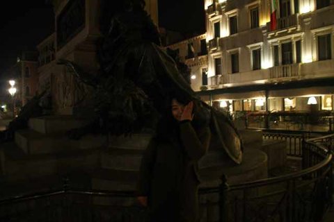 베네치아를 상징하는 날개달린 사자 동상을 배경으로 한장.