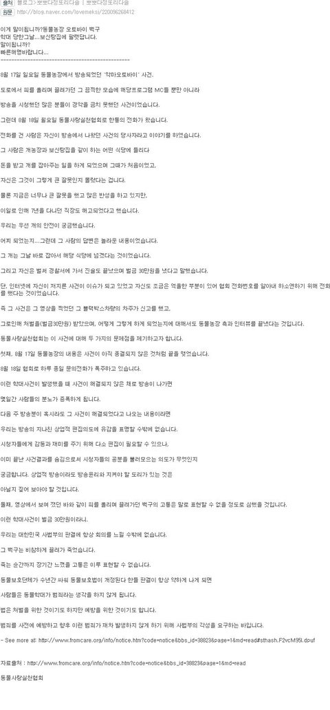 그 동물농장오토바이에 백구 끌고간 그사건 이미 마무리 되었다네요 ㅠ