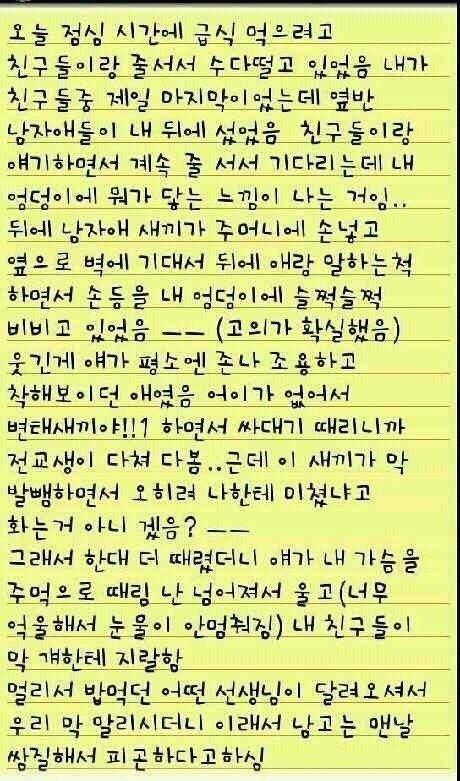 당연히 화자가 여자라고 생각하지. 줄서서 수다 떤다고 했고 옆반 남자애 가 어쩌구 자꾸 이렇게 얘기하니까. 남고에서 옆반 학생을 남자애라고 부를 일이 뭐있겠어? 첨부터 사람들 착각하라고 쓴 글인데