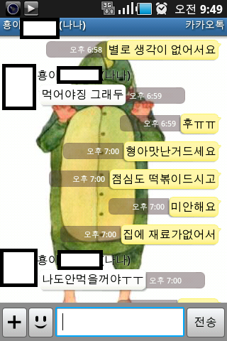 아래는 제가 18살때 충대중문에 잇던 신길동매운짬뽕집?? 아시는분 계신가요!!거기서 알바했을때 ㅎㅎㅎ 탕수육 만드는 법을 배워서 원룸집에서 해먹어봤거든요 ㅎㅎ그때 카톡했던 내용인데 왜 스샷찍었는진 잘 모르겠네요.ㅎ( 아마 형이 하트날려서... 그거 찍을려고 했던것 같아요..ㅠㅠㅠ
