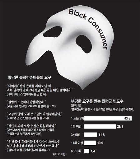 대한상의가 지난해 4월 국내 중소기업 203곳을 대상으로 블랙 컨슈머 관련 설문조사를 벌인 결과 83.7%가 소비자의 악성 클레임을 '그대로 수용한다'고 답했다. '법적 대응을 통해 적극적으로 대처한다'는 답변은 14.3%에 그쳤다.