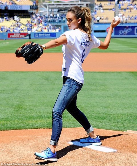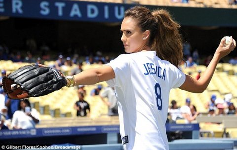 유니폼 입고 날렵한동작으로 시구를하는 제시카알바~