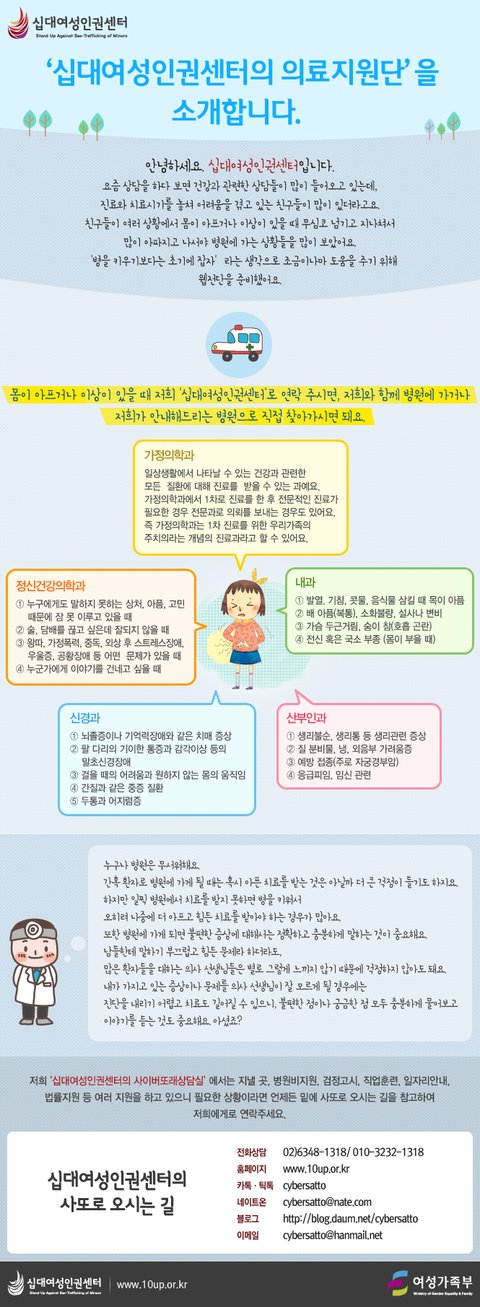 몸이 아프거나 이상이 있을 때 저희 '십대여성인권센터'로 연락 주시면, 저희와 함께 병원에 가거나 저희가 안내해드리는 병원으로 직접 찾아가시면 돼요.