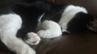네네가 현관문 앞 쇼파에서 남편을 기다리고 있어요!