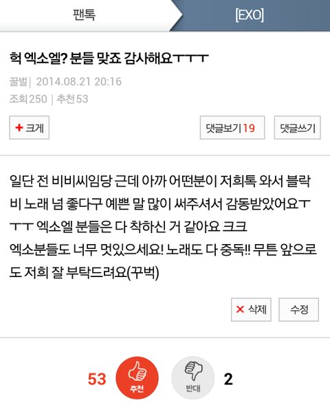 아까 이 글 올린 비비씨입니다 우선 댓글들 하나하나 다 봤는데 좋은 말 해주신 분들 정말 감사드리구요..! 그리고 블퀴 관련 댓글들이 많던데 다른 비비씨분들은 어떨지 모르겠지만 일단 저는 그것도 다 저희가 가지고 가야 될 거 같다고 생각해요ㅜㅜ.. 그리고 제가 괜히 글 올려서 엑소팬분들끼리도 싸움아닌 싸움 나게 해서 정말 죄송합니다.. 음 그니까 결론은 저때문에 괜히 팬분들 사이에도 일 커져서 정말 죄송하고 앞으로 저도 블퀴나 등등 눈에 나쁘게 보이지 않게 정말 많이 노력하겠습니다 아까 댓글 다셨던 분들이 이 글 보실진 모르겠지만 긴 글 읽어주셔서 감사하고요ㅜㅜ.. 앞으로도 엑소 팬분들께도 더 많이 배우고 참고할수 있는 비비씨가 될게요!! 정말 죄송합니다ㅜㅜ