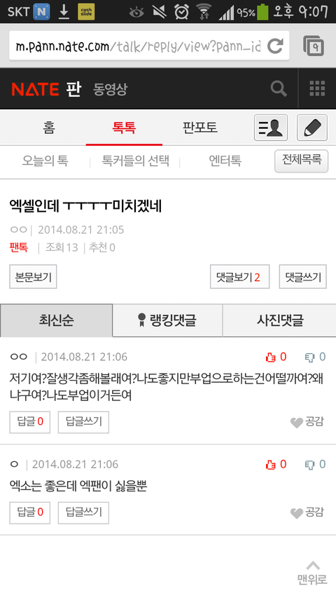 내가 엓톡볼때 들어가기가 귀찮아서 그냥 최신순으로 보거븐?? 근데 블락비톡에 엑셀이리면서 쓴글 들어가봤더니 댓글ㅋㅋㅋㅋㅋㅋㅋ조카 오랜만에듣네 ㅋㅋㅋㅋㅋㅋㅋㅋㅋㅋㅋㅋㅋ