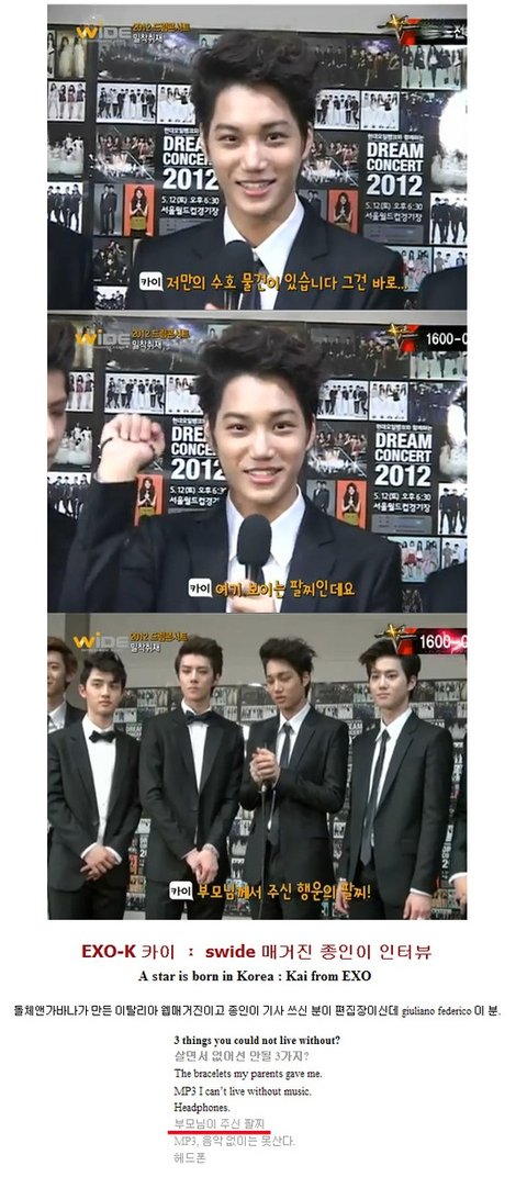 골든디스크 대상 수상 후 인터뷰, 이 순간 가장 생각나는 사람은?  카이를 만들어 준 건 팬들이라고 생각한다. 감사하다.http://m.news.naver.com/read.nhn?mode=LSD&mid=sec&sid1=106&oid=241&aid=0002178607