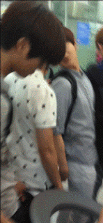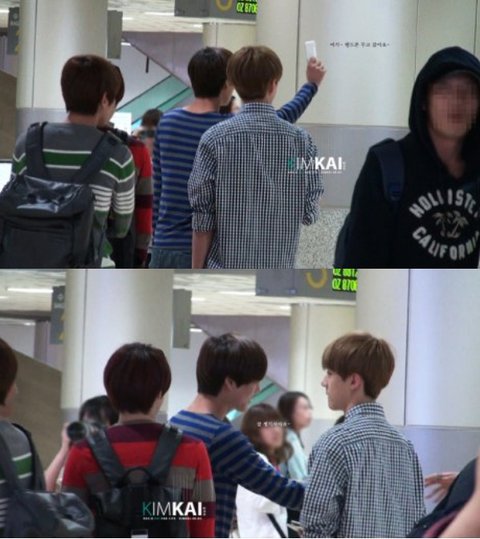 공항에서 핸드폰을 떨어뜨린 팬에게 핸드폰을 주워 건네는 종인이.