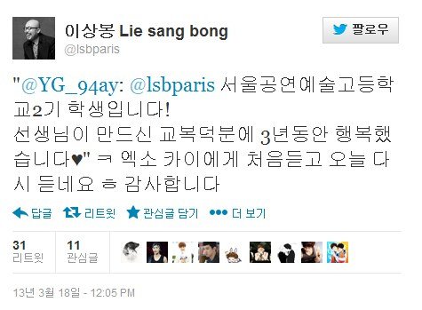 정말 따뜻한 글이다ㅜ 사람 일은 아무도 모르는거고 앞으로 언제까지 카이를 사랑하는 마음이 영원 할 거라는 건 아무도 알 수 없지만............. 저 글은 정말 진심으로 느껴져 애잔하고 서글프고 기쁘고 행복하다 카이를 좋아하는 내 맘도 저만큼이고 싶다 그리고 저 글쓴이도 변함없이 카이를 사랑해줬음 좋겟고 지금 카이 옆에 있는 팬분들도 변함없음 좋겠고 무엇보다 나도 너를 사랑하는 마음 변함없이 함께 이고 싶다 적지않은 나이에 카이를 알게되고 좋아하고 사랑하고 남편(ㅋㅋ그래서 울 남편은 카이 싫어함)은 주책이라고 하지만, 남들이 보면 나이먹고 머 하는 짓 인가 하겠지만 너의 생일때 생일선물을 사주고 싶은 맘이 듣것도 니가 처음 이였고! 난 니가 종인이가 카이가 항상 행복 했으면 좋겠고 잘 됐으면 좋겠다