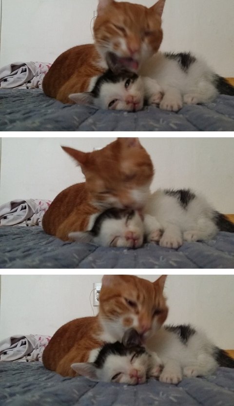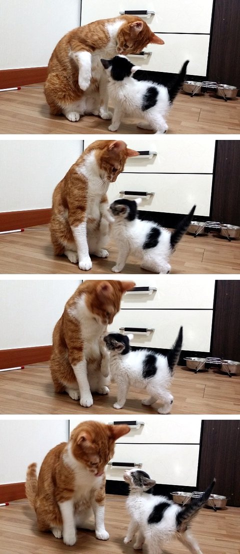 보리는 쌀이를 핥아주는 척 하면서 물어요.
