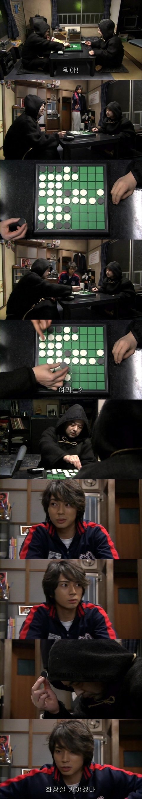 자신이 규칙을 어겼다는것을 깨닫고 포기하고 그둘이 게임하는것을 지켜보는 카즈오..