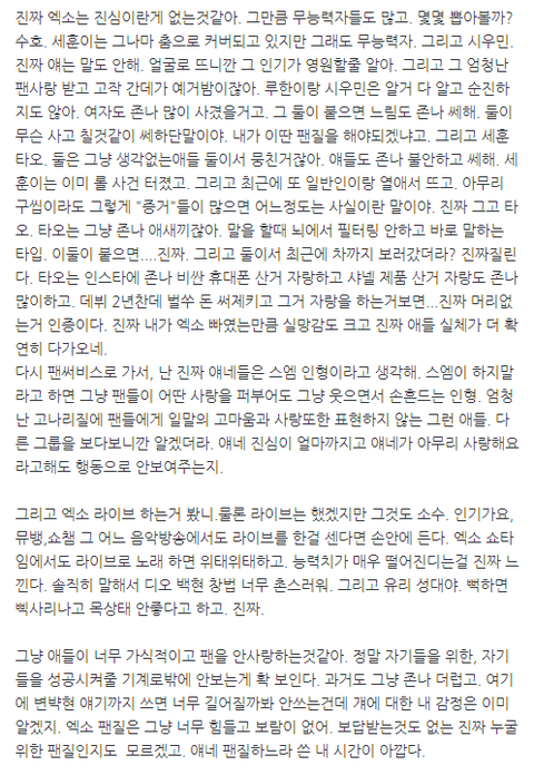 나 엑소 탈덕할란다. 일단 올해 스엠에 진짜 많은 일이 생겼잖아. 크리스 소송부터 변백 열애설까지. 근데 그걸로 인해 애들 인성이 더 확실히 보이더라. 그리고 다른 중소그룹 보다가 얘네 보니깐 얘넨 진짜 그냥 스엠 인형같아. 팬싸나 이런데에선 지들이 조카 고귀하고 엄청난 존재인마냥 바리게이트 치고 경호원들 몇십명씩 붙히고. 그리고 팬을 을로 만들고 지들이 팬들 우위에 설려고 하고. 진짜 팬썹도 안하는주제에 그냥 스엠 인형처럼 팬들과 소통도 안하고 그냥 바리게이트 뒤에서 손만 흔들고 있고. 진짜 콩깍지 빼고 보니깐 엑소 중에서 진심으로 팬을 사랑하는애가 과연 몇명일까 싶다. 거희다 팬들을 이용하고 별로 소중하게 생각하지도 않아. 그냥 길거리에서 팬들을 봐도 다 사생취급하고 개같은 눈빛으로 째려보고. 그럼 또 엑소빠들은 이렇게 쉴드치겠지. 그만큼 상처가 많으니깐 그런거 아니겠냐고. 그리고 또 트라우마 운운하면서 지랄하겠는데. 얘네 고작 데뷔 2년차야. 조카 신인이라고. 근데 벌써부타 금수저 물고 데뷔하니깐 지들이 슈퍼스타라도 된듯이 말해. 솔직히 일반인들은 크리스랑 변백현 째고 누가 누군지 알지도 못해. 근데 지들이 세계를 장악한것처럼 행동하고. 솔직히 말해서 엑소가 팬서비스란거 한적 있냐. 맨날 방굿방긋웃어주면서 손만 흔들고. 그리고 얘넨 능력도 지지리 없어. 절대로 라이브 안하지. 세상에서 자기 콘서트때 라이브 안하는 인간이 어딨어. 얘네는 12곡있다하면 거기서 3-4곡밖에 라이브 안해. 보통 가수들은 다 라이브로 하거든? 그리고 카이 레이, 그리고 뭐 세훈 빼면 춤 잘추는애들 어딨냐? 그리고 엑소 무능력자 조카 많잖아. 대표적으로 시우민. 시우민은 말도 안하고. 그리고 애들이 조카 쌔해. 데뷔초부터 변백현 일진 과거 털렸지. 박찬열 호연이랑 싸이 털렸지. 그리고 구희수 과거. 루한 미성년자 운전. 수호 과거 인터넷 털렸지. 그리고 데뷔 후인 오세훈 롤 사건. 진짜 이건 말이 안나온다. 오세훈은 자기가 연예인이란거 자각이 없어 하예쁜이랑 누나누나 거리면서. 그것도 팬들이 얼마나 덮어줬는데. 그리고 예거밤...진짜... 크리스랑 루한이랑 시우민이랑 밤에 몰래 숙소 빠져나가서 여자끼고 술집에서 놀았던거. 여자들도 그렇게 싼티날수도 없더라. 세상에서 제일 행복해보이는 표정으로 여자 끼고 사진까지 찍었어ㅋㅋ 진짜 그걸 또 팬들이 기를 써서 묻었지. 그리고 크리스 팬들이랑 팬미팅한거. 늑미 컴백 일주일 잔에 몰래 중국으로 튄다음 공항에서 지 팬들한테 초콜릿 나눠주면서 지랄 쩔었잖아. 진짜 시녀병걸린 팬들이 기를써서 묻었어.