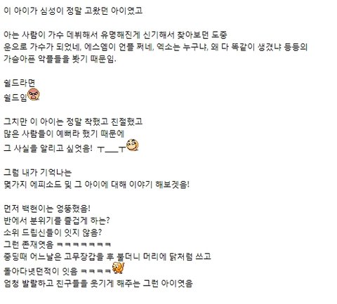 '음악이나 아이돌에는 전혀 관심이 없었음.   그럼에도 이 글을 쓰는건 이 아이가 심성이 정말 고왔던 아이였고'