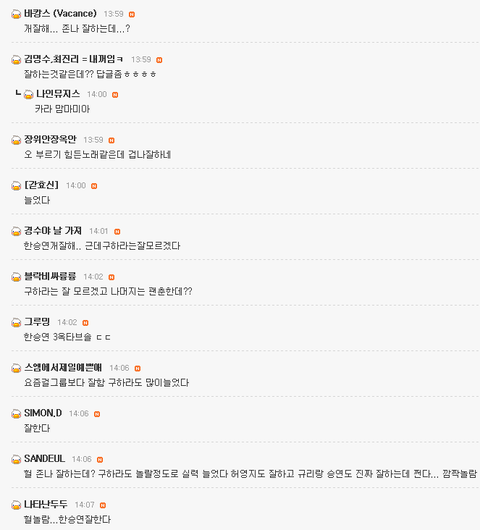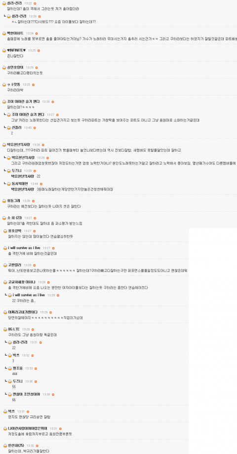 구하라도 가창력때문에 스트레스받는지 꾸준히 조금씩 나아지는중 막귀들은 좋아졌는지 그대로인지 구분도 못하고 노래연습 좀.. 이러면서 까지;; 아직 잘한다고 까지는 아니더라도 일반 아이돌 평균정도는 됨