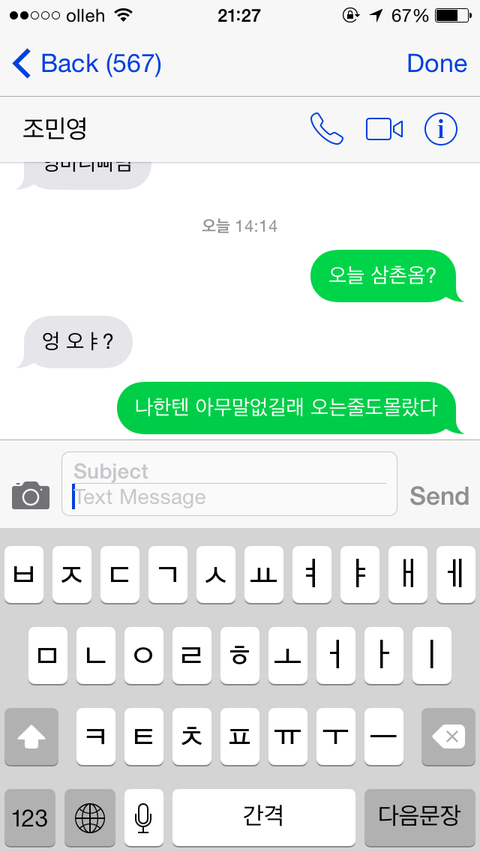 "오늘 고모집가" 라구요 귀엽죠 이제막 핸드폰이 생겨서 가끔씩저에게 문자해줘요^^